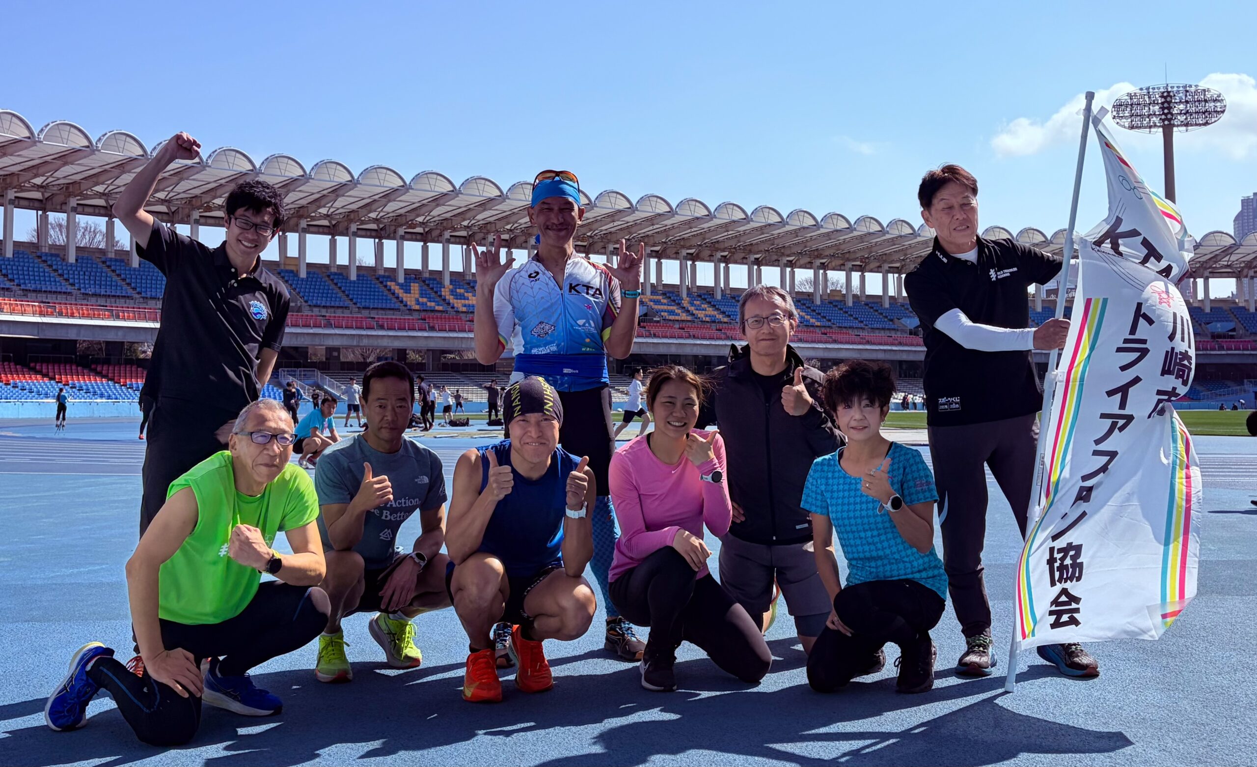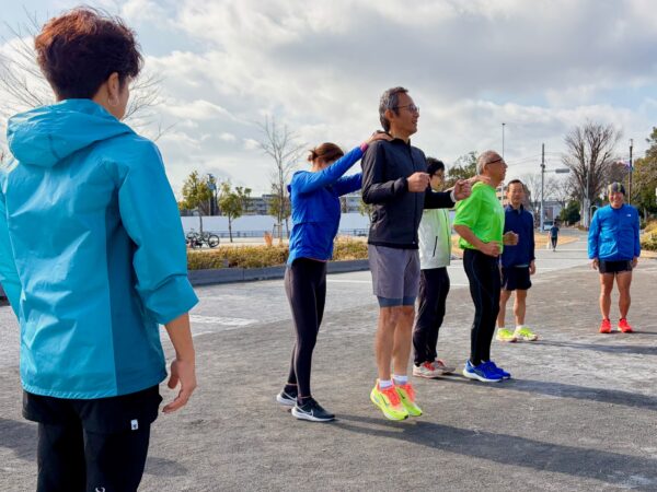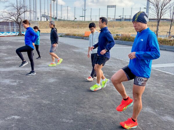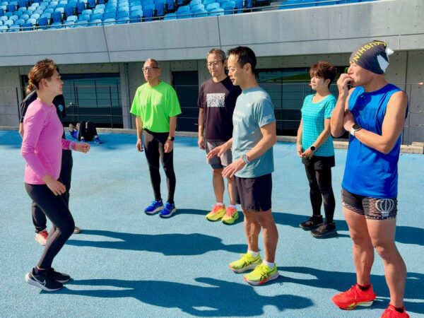 「風が強い中でしたが、とても暖かく良い気候で練習ができました。今回は地面からの反発を感じること、重心を真下に置き大きい筋肉で受け止めることを中心にジャンプ系のドリルと、一歩一歩重心の位置を確認しながら前に進んでいくドリルを行いました。メイン練習では、ドリルの動きを意識して400m→300m→200m→100mと距離を減らしてスピードを上げていきました。沢山走らなくても、一つひとつの動きに集中して走ることで、かなり負荷の高い練習になったと思います。トライアスロンのランは、スイム~バイクで疲れたところで走らなければならないので、いかに自分の力を上手く地面に伝えて楽に進むかが重要になります。今回の練習会で、少しでも反発をもらう感覚をつかんでいただき、今後の練習のヒントになれば嬉しいです」