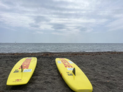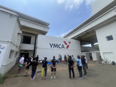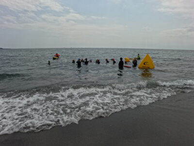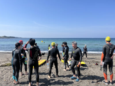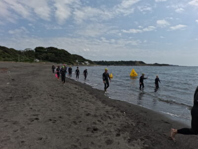 スイムはYMCAの目に前にある和田長浜海岸にて行います。ライフセイバーも配置されますので安心して練習ができます。足の着く場所でまずは基本的な練習を中心に実施します。