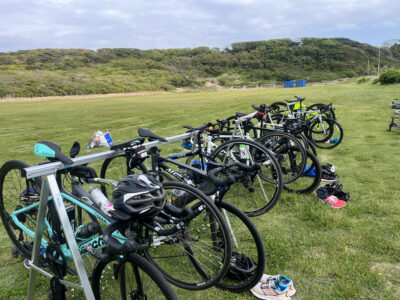 トレーニングはYMACの運動広場をベースにして行います。芝生の緑がきれいで広くて気持ちいのいい広場です。バイクラックも用意してトランジションの練習なども実施します。